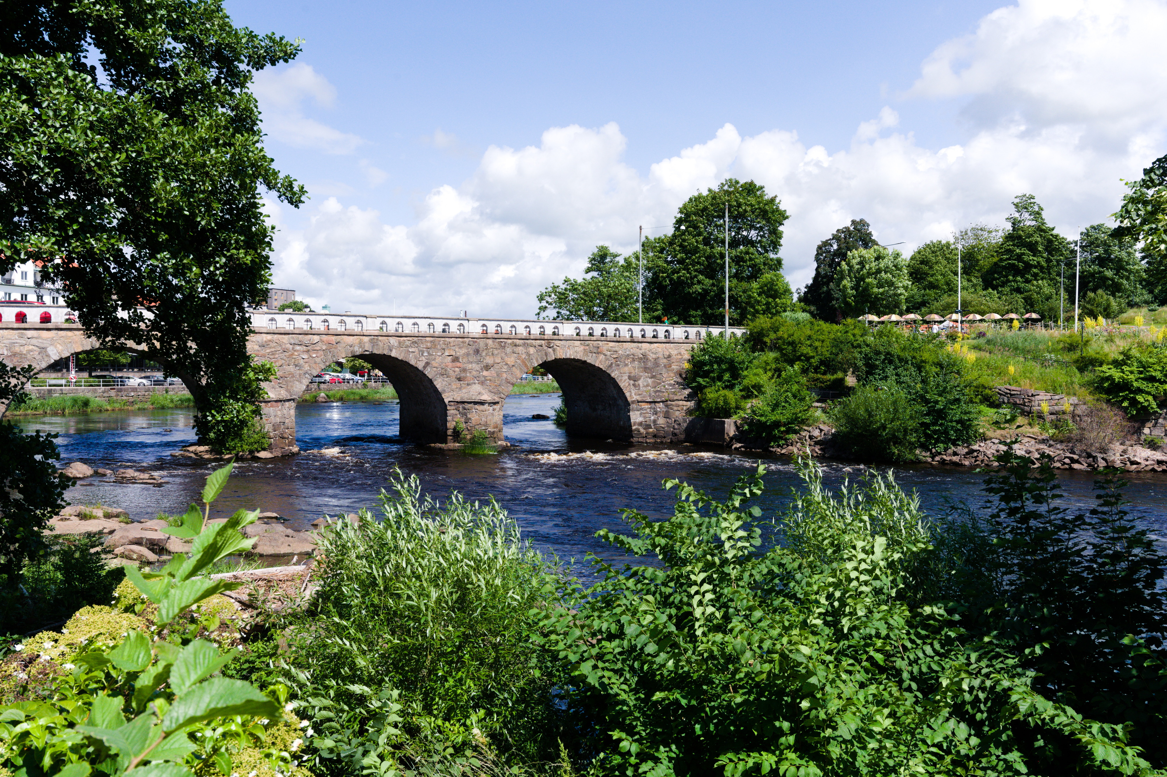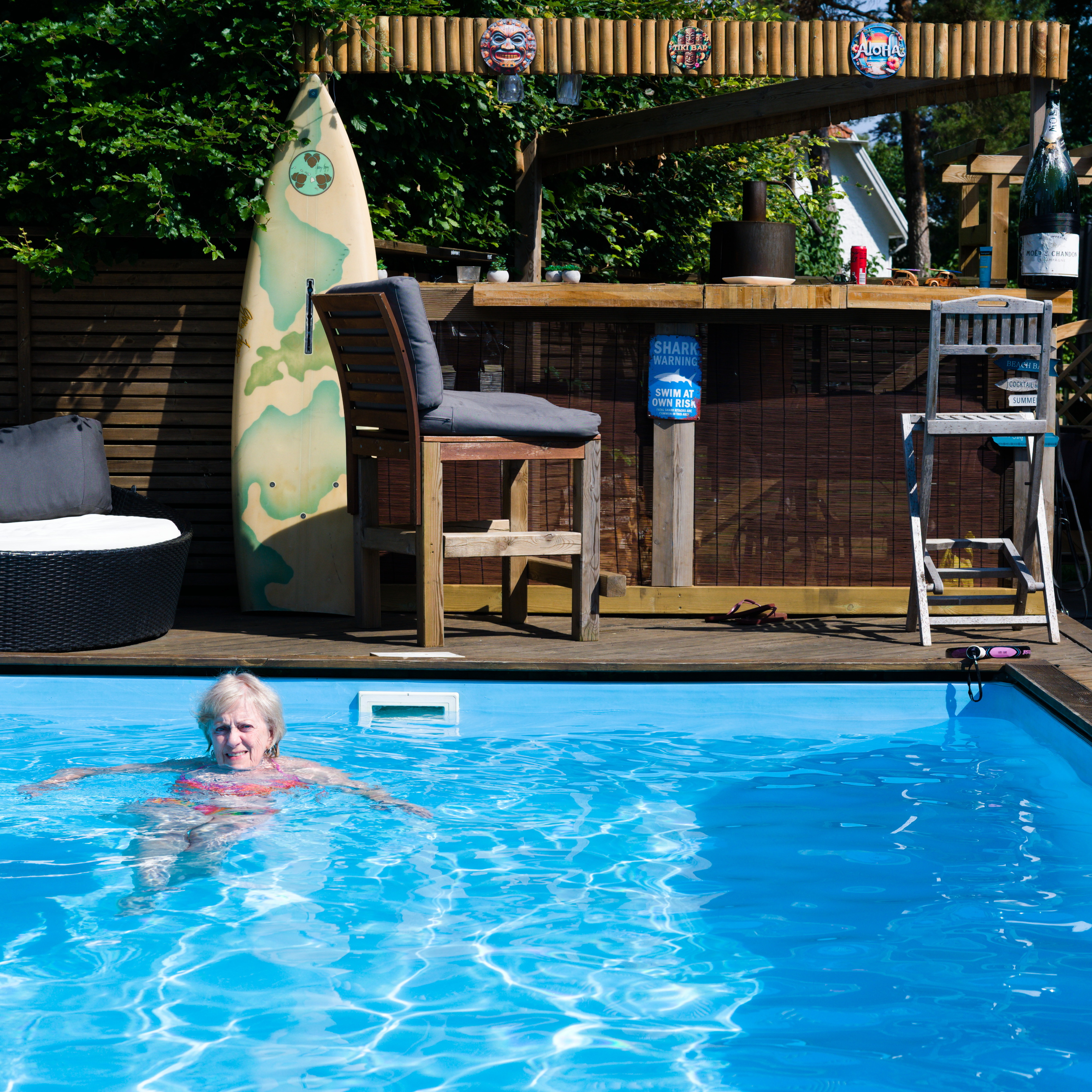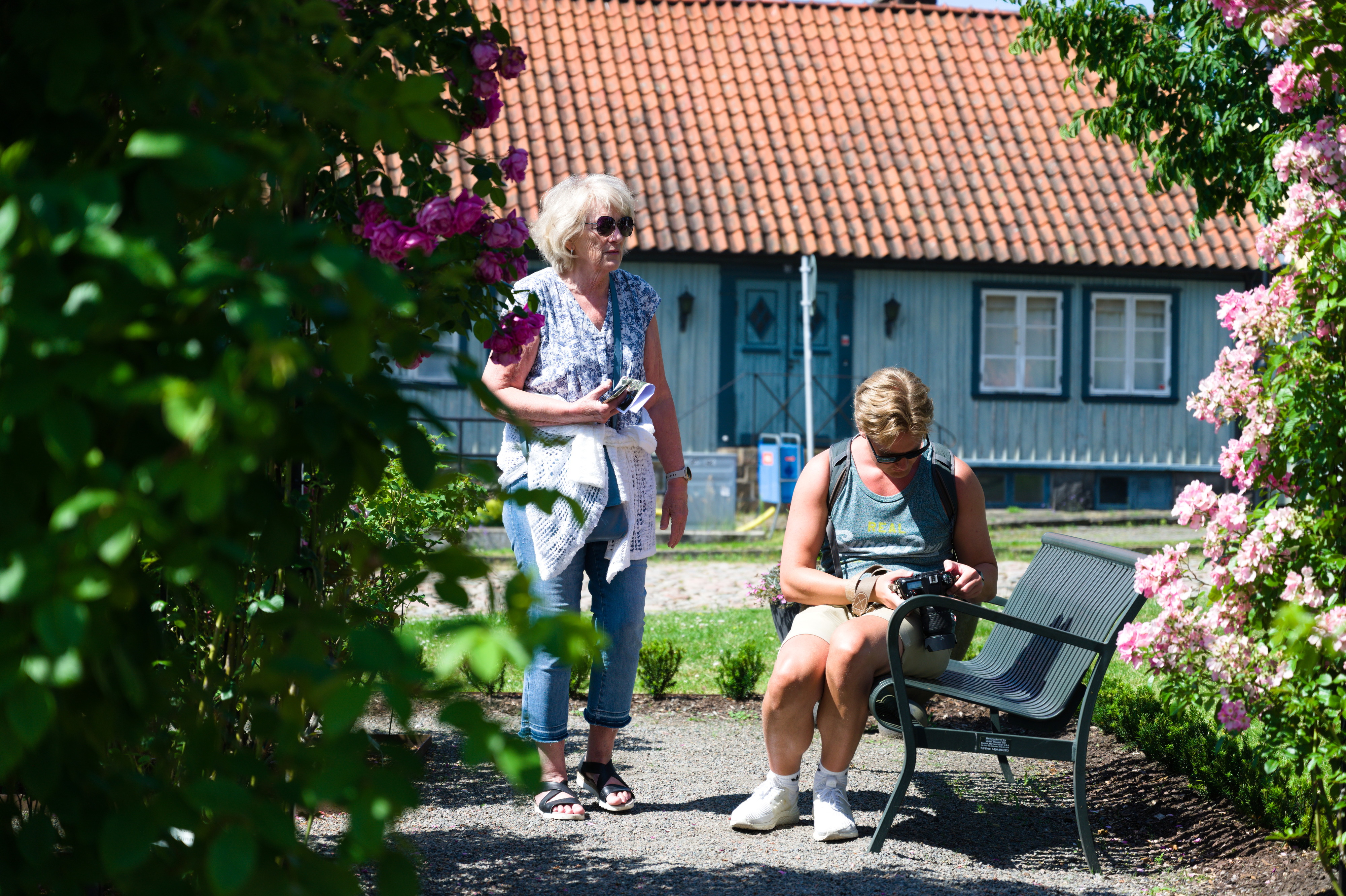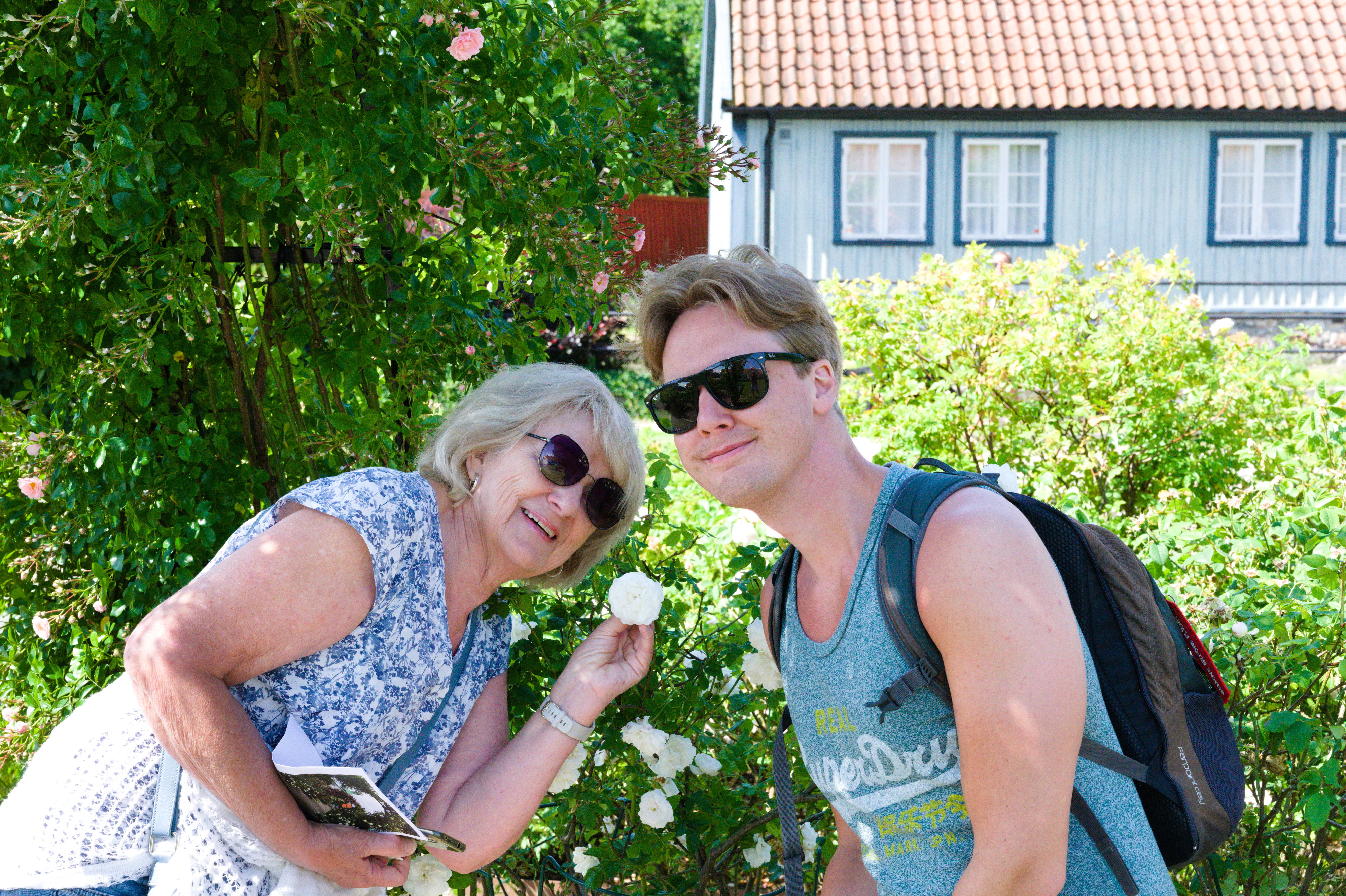 För mammas 70-års dag hyrde vi ett hus i Falkenberg med pool! Stadsvandring med Laurentiiparken med dess rosenbuskar, Badhusparken och Vallarnas friluftsområde med Dag-Ottos utomhusteater avverkades, inklusive räkmacka vid Tullbron.